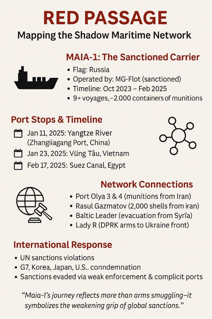 On February 17, 2025, the Maia-1, a Russian cargo ship sanctioned for transporting North Korean munitions, arrived at the southern anchorage of the Suez Canal—marking the first time such a vessel ventured beyond East Asia.