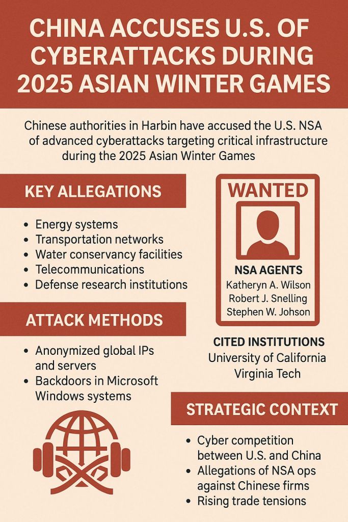 Chinese authorities in Harbin have publicly accused the U.S. National Security Agency (NSA) of launching advanced cyberattacks against critical infrastructure during the 2025 Asian Winter Games, escalating tensions between the two global powers in the digital domain