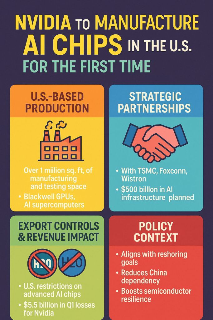In a major strategic pivot, Nvidia has announced it will begin manufacturing its next-generation AI chips and supercomputers inside the United States. The move comes as Washington intensifies export controls on advanced AI technologies, particularly those destined for China.