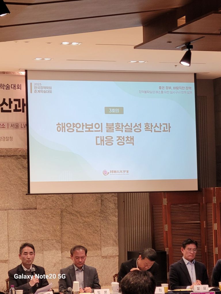 회의장에 도착하니 다행히 예정된 시간보다 20분 늦게 시작되어 교수님들과 해양경찰청 기획조정관님 그리고 한국해양과기술원 양박사님의 해양안보에 관한 인싸이트를 놓치지 않을 수 있었다.