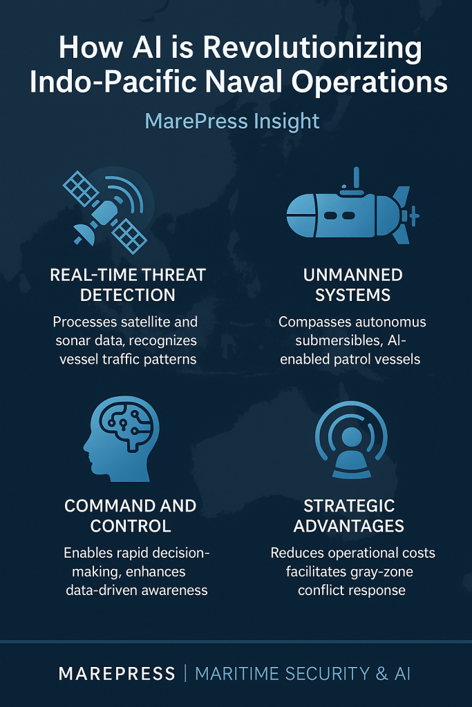 As maritime security challenges in the Indo-Pacific grow increasingly complex—ranging from illegal fishing and piracy to strategic competition between major powers—navies are integrating AI across multiple domains. From unmanned surface vehicles (USVs) and autonomous underwater drones to AI-enhanced command and control systems, the goal is clear: enable faster, smarter, and more adaptive naval responses.