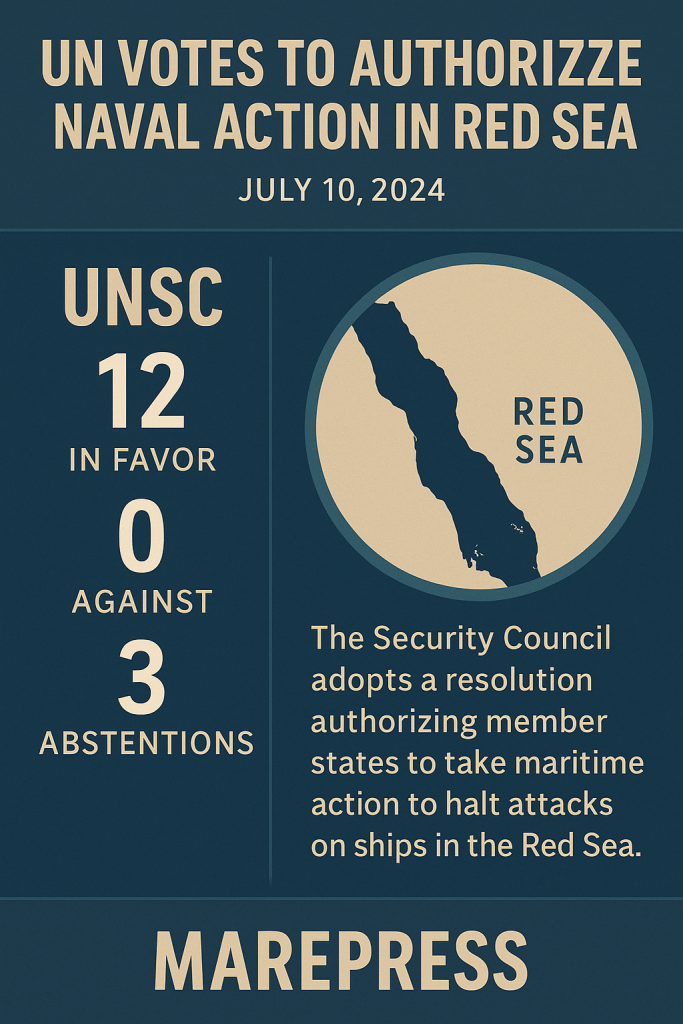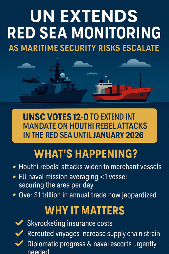 In July 2025, the United Nations Security Council (UNSC) unanimously (12-0) voted to extend its monitoring mandate on Houthi rebel attacks in the Red Sea until January 15, 2026.
