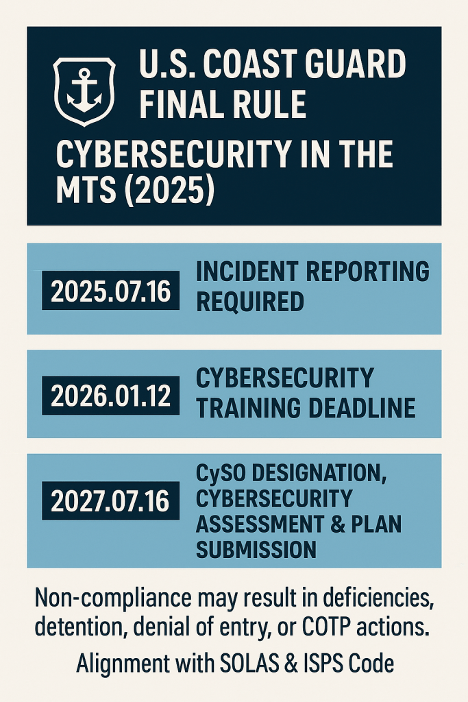The U.S. Coast Guard (USCG) released its long-awaited Final Rule on Cybersecurity in the Marine Transportation System (MTS), which officially went into effect on July 16, 2025. This regulatory milestone addresses the growing cybersecurity risks faced by the maritime sector, including hacking, ransomware, GPS spoofing, and potential cyber-piracy incidents. With this rule, the USCG aims to align the United States with international maritime security standards, such as SOLAS and the ISPS Code, while also strengthening domestic resilience under the Maritime Transportation Security Act (MTSA).