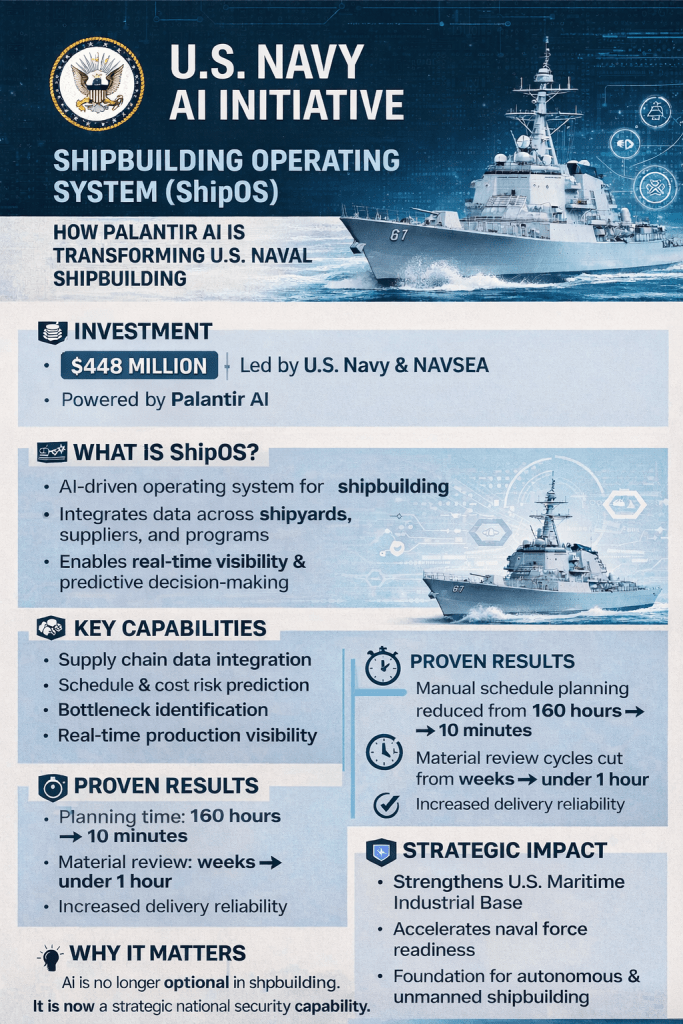 The U.S. Navy is investing $448 million to modernize and accelerate its shipbuilding operations by integrating Palantirโs AI and data analytics software across the maritime industrial base. This initiative โ known as the Shipbuilding Operating System (ShipOS) โ aims to bring cutting-edge artificial intelligence and autonomy tools into the ship design, production, and supply chain management workflow. navy.mil+1