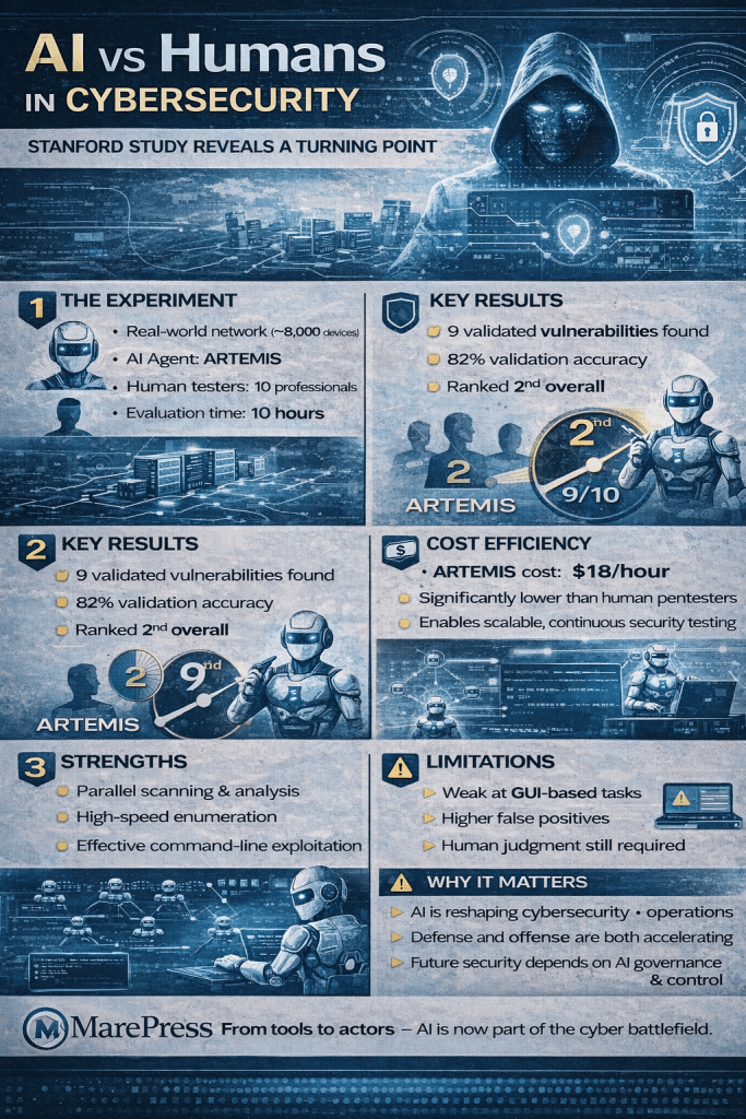 Researchers at Stanford evaluated ARTEMIS against ten experienced human penetration testers on a large real-world network with roughly 8,000 connected devices including servers, computers, and smart systems. ARTEMIS ran autonomously and scanned, probed, and analysed the network for vulnerabilities. Implicator.ai